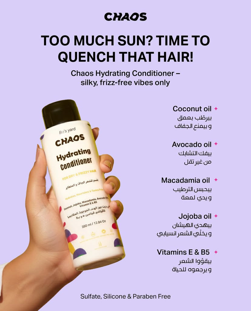 Chaos Hydrating Conditioner acts as a moisture-locking shield. Coconut Oil and Avocado Oil form a protective barrier to seal in hydration from the shampoo, preventing moisture loss throughout the day. Designed specifically for mid-lengths and ends,